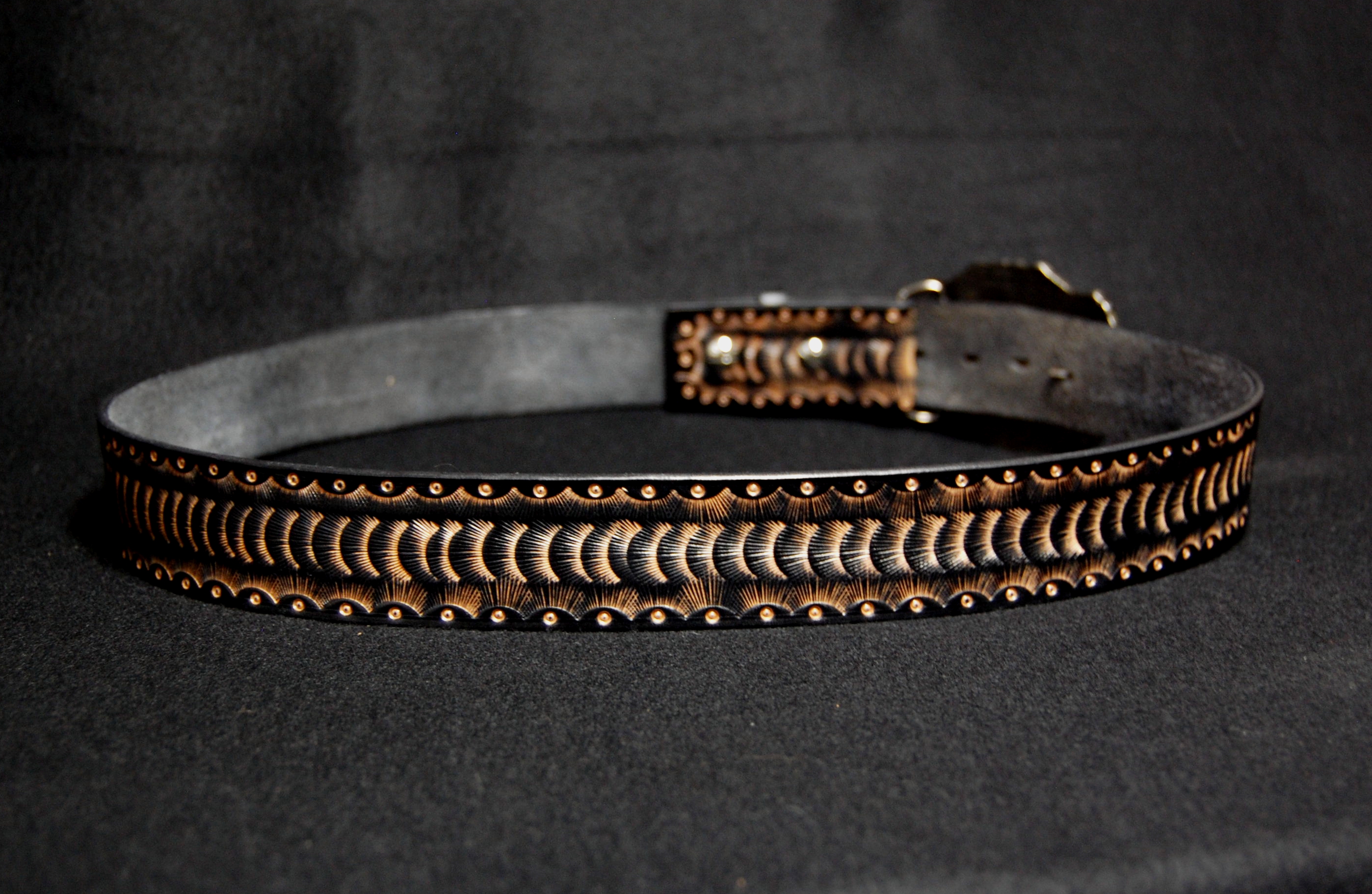 Custom leather Dragon Scale belt ← Previous Next → SOLD Custom leather belt in a rustic Dragon Scale design