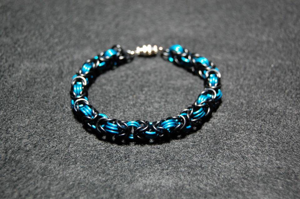 Byzantine Bracelet ← Previous Next → Black and Blue Byzantine Bracelet Custom Byzantine bracelet in blue and black anodized aluminum