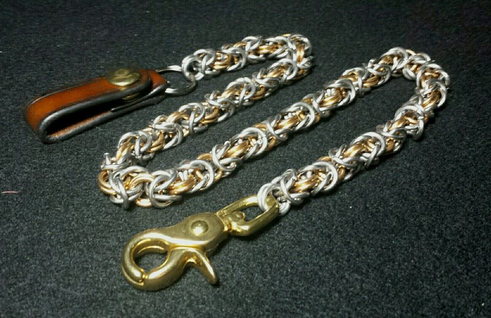 Byzantine wallet chain featuring stainless steel and jeweler’s brass rings with a solid brass trigger snap and matching heavy duty leather belt fob