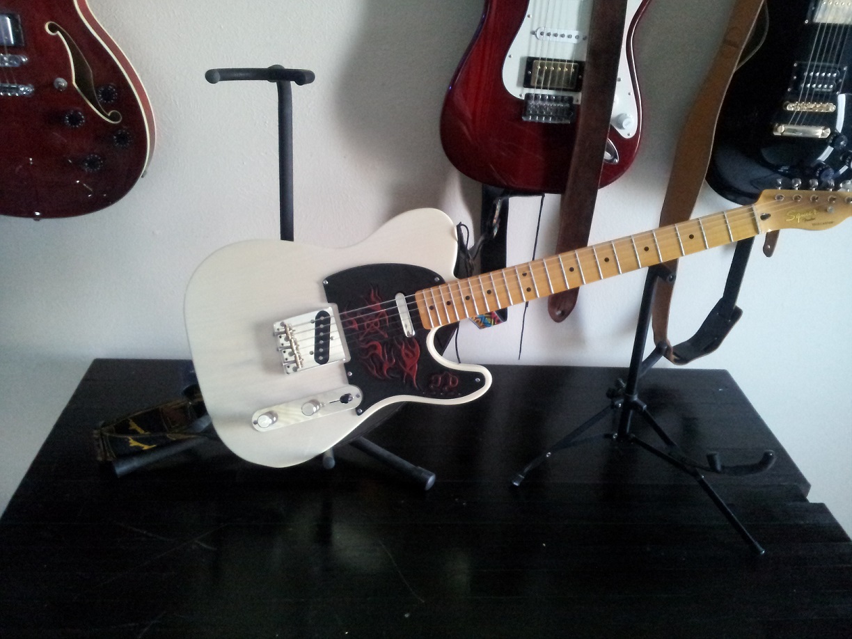 JD Flame Pickguard Mounted ← Previous Next → SOLD Custom tooled leather pickguard for Squier Classic Vibe Telecaster Like Loading...