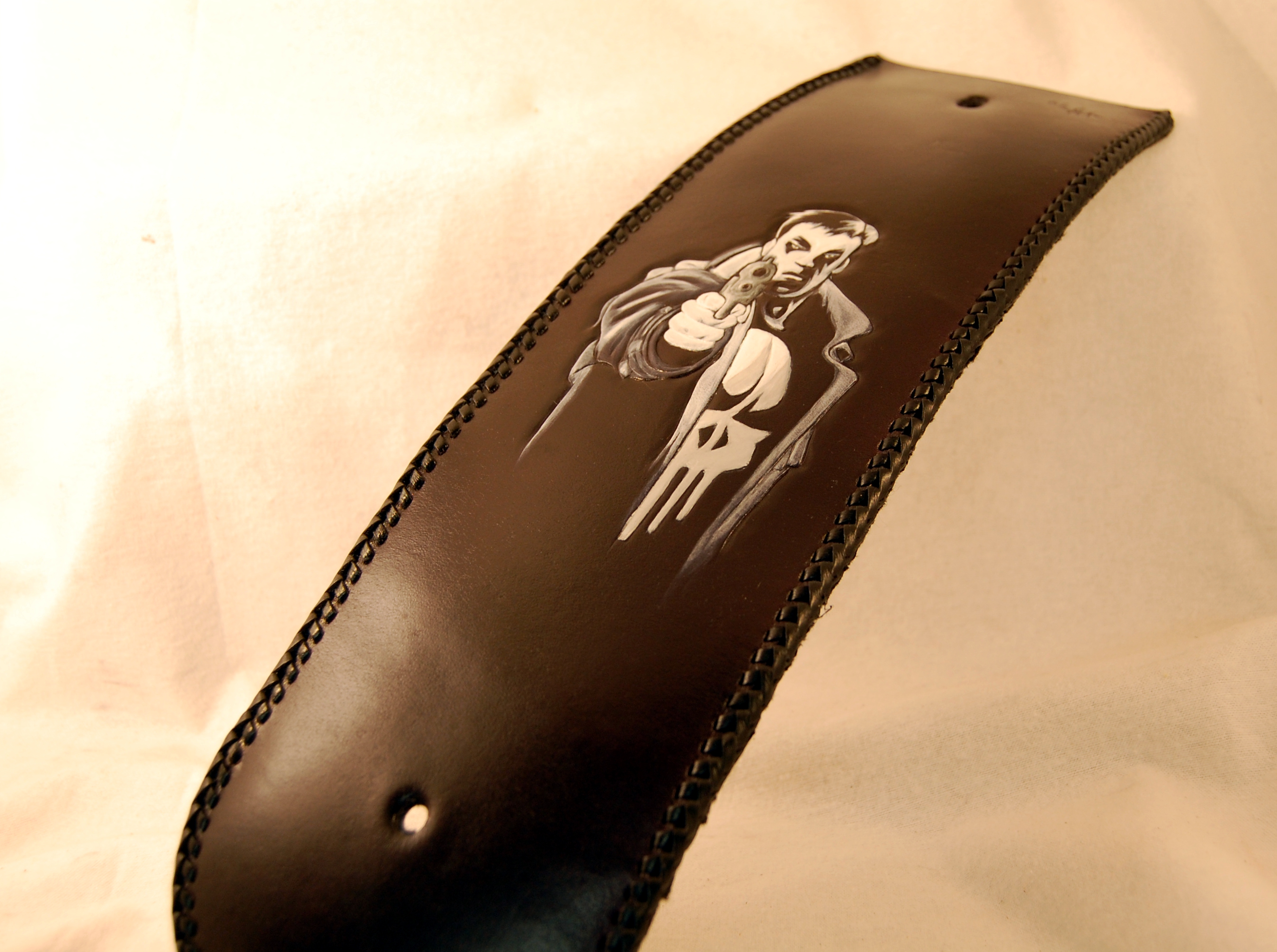 PunisherBib_01 ← Previous Next → SOLD Custom tooled leather rear fender bib for a 2010 Harley Davidson Sportster Iron 883. Artist: Allen Mewes Like Loading...