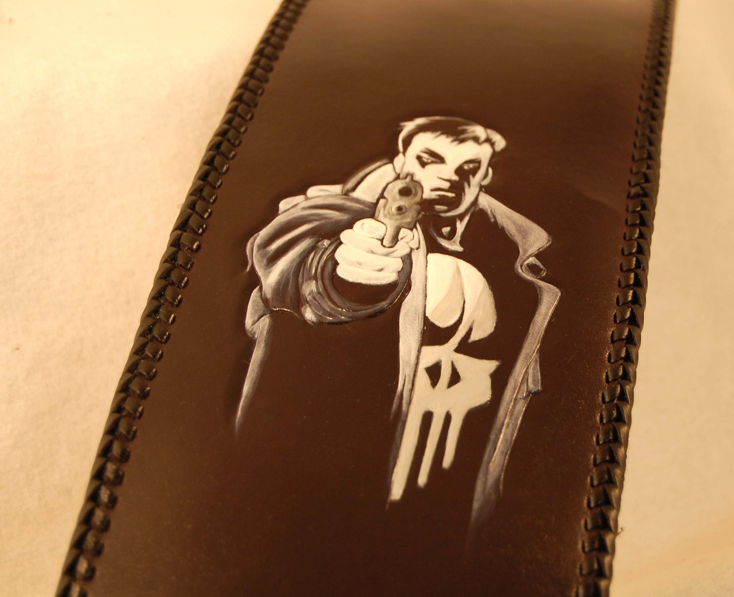 PunisherBib_02 ← Previous Next → SOLD Custom tooled leather rear fender bib for a 2010 Harley Davidson Sportster Iron 883. Artist: Allen Mewes Like Loading...