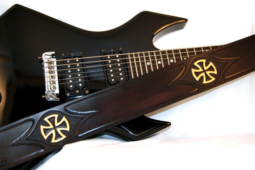 Custom Tooled Leather Guitar Strap With Golden Skull ← Previous Next → SOLD Custom 3″ Guitar Strap with gold accents Like Loading...
