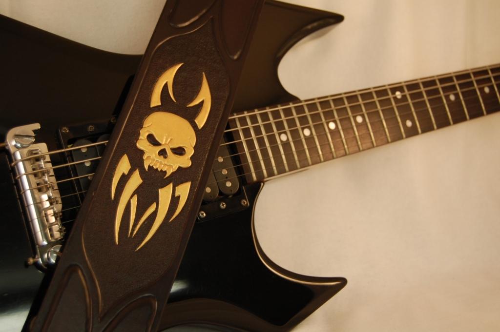 Custom Tooled Leather Guitar Strap With Golden Skull ← Previous Next → Custom 3″ Guitar Strap with gold accents Like Loading...