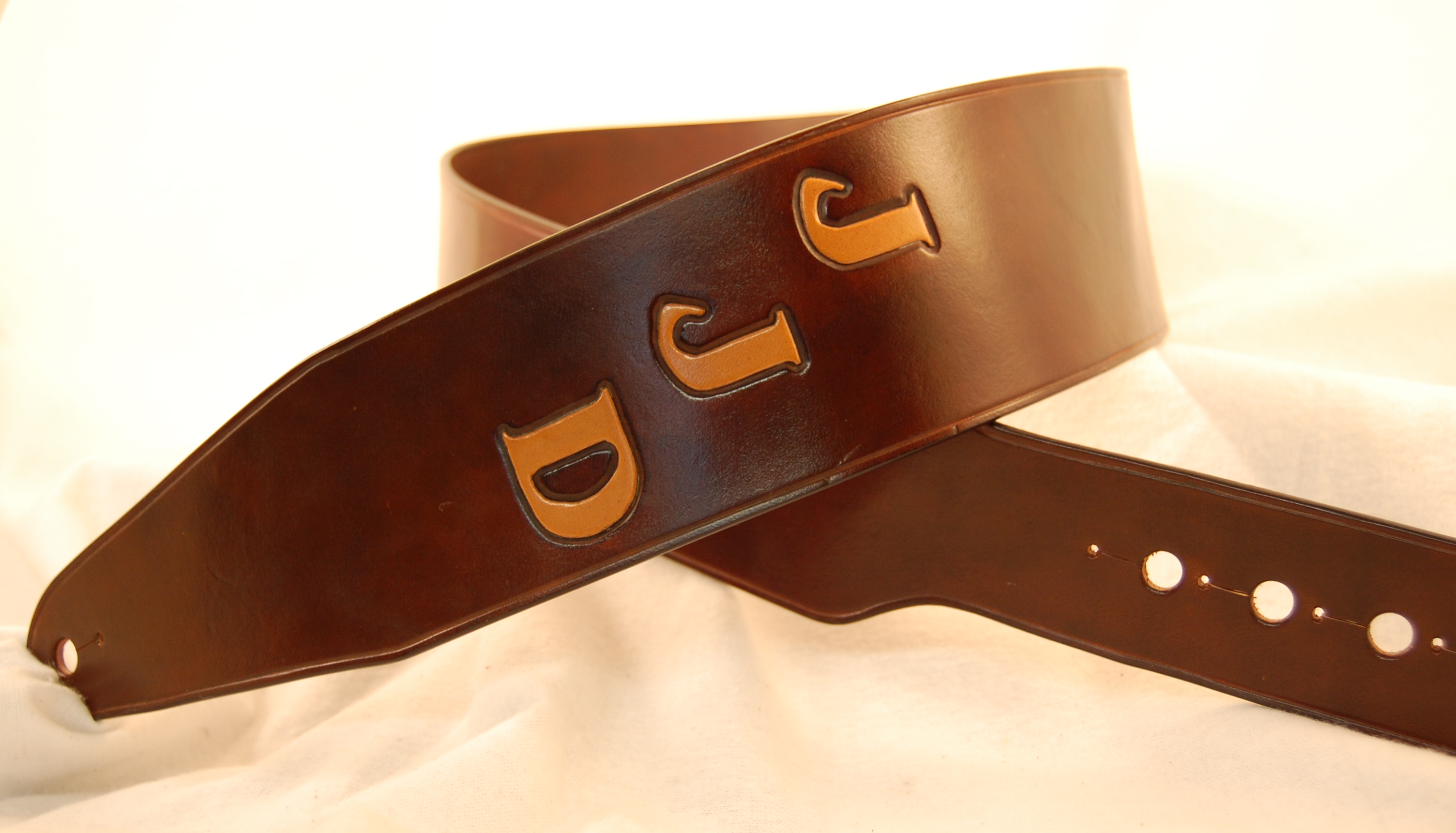 Custom Tooled Leather Guitar Strap in Rustic Brown ← Previous Next → SOLD Basic guitar strap with tooled letters, rustic coloring, and pigtail adjustment Like Loading...