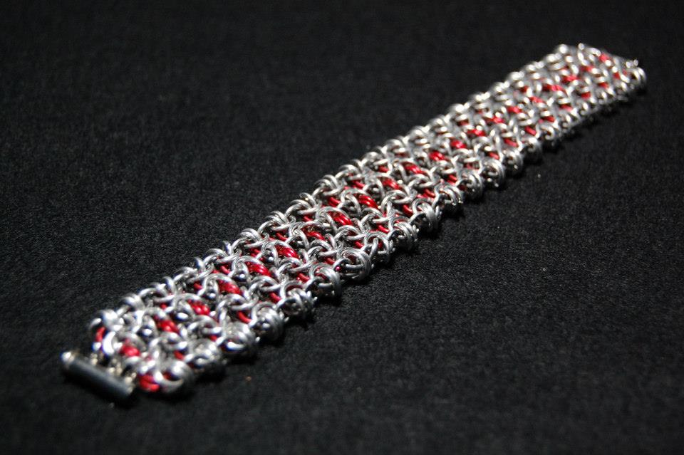 4 Row Linked Byzantine Bracelet ← Previous Next → Silver and Red 4 Row Linked Byzantine Bracelet Gorgeous 4 Row Linked Byzantine bracelet in silver and red anodized aluminum.