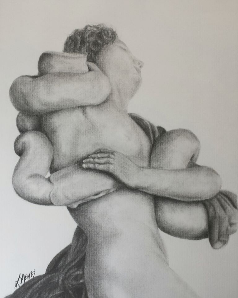 For the next stage I’ve spent a lot of time building out the value range and finding the anatomy. I tend to jump around quite a bit to avoid my natural tunnel vision. If I don’t, I’ll quite frequently find myself overworking a certain section because it just doesn’t feel right, when in reality it’s only a comparative issue since the surrounding portions aren’t there yet. So here you see I’ve built up some of the darkest areas we mentioned before and began lightly building out the muscle forms. I also further defined some of the drapery folds and began rendering his fingers. By this point we’re really starting to feel the power of the serpent squeezing on his body to render him lifeless.