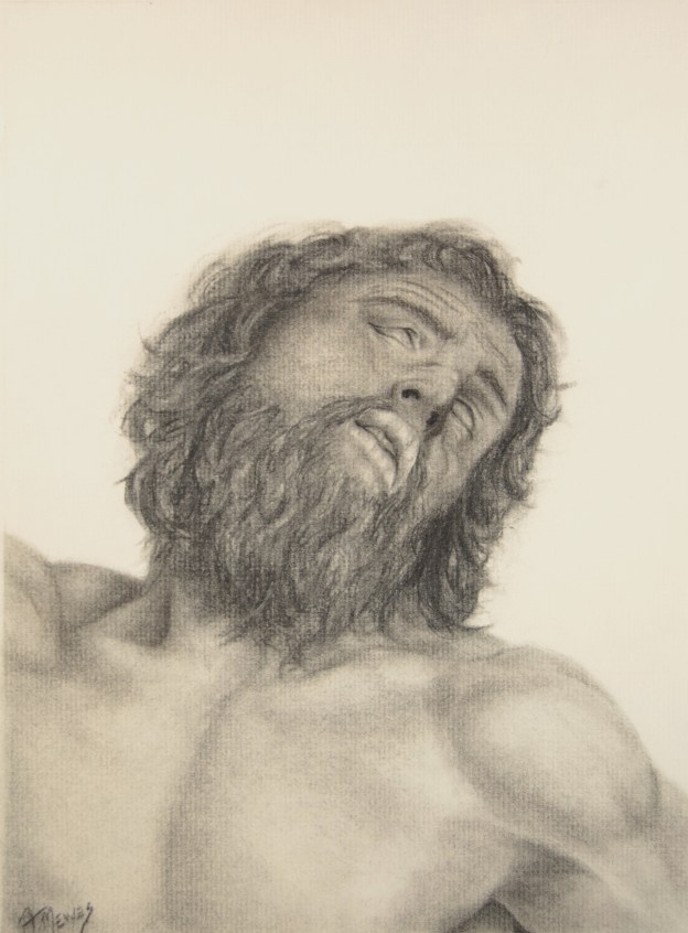 After finishing up the values on his body to really make the shoulder structure pop out, I made a few finishing touches to the beard and hair, trying to maintain the curls and the layers that were built up. With the completion of this one, I’ll be moving on to the final piece featuring all three figures. This will be the largest charcoal piece I’ve done and it should prove to be quite the fun challenge. Remember that this and other pieces are currently available to purchase as prints on my Saatchi Art profile at saatchiart.com/allenmewes. I actually reworked a few of the photos today to make sure that they’re all crisp and perfect to adorn your wall. If you’d like to wait for the originals, they’ll be available for purchase some time in March of next year.